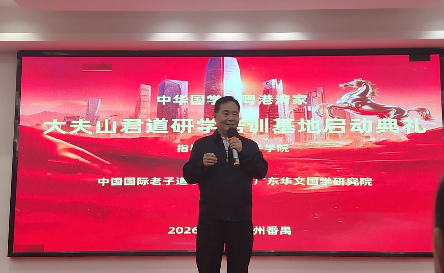 王刘瑜:文化传承人,被聘为中国国际老子道学研究院名誉院长。 他表示,番禺作为岭南文化的重要发源地,此次牵手老子研究院, 既是对中华优秀传统文化的虔诚传承与弘扬,更是对大湾区文化建设的创新探索与生动实践。未来,随着培训研学基地的常态化运营,大夫山将有望成为集文化传承、研学实践、生态教育、国际交 流于一体的湾区文化新地标,吸引更多人走进老子文化、感悟经典智慧、践行东方哲思。而老子思想所蕴含的千年智慧,也将在大湾区的创新实践中不断焕发新生机、彰显新价值,为建设人文湾区、 生态湾区、幸福湾区提供源源不断的精神滋养与智慧支撑,书写中华优秀传统文化与时代同频共振、与湾区共生共荣的崭新篇章。